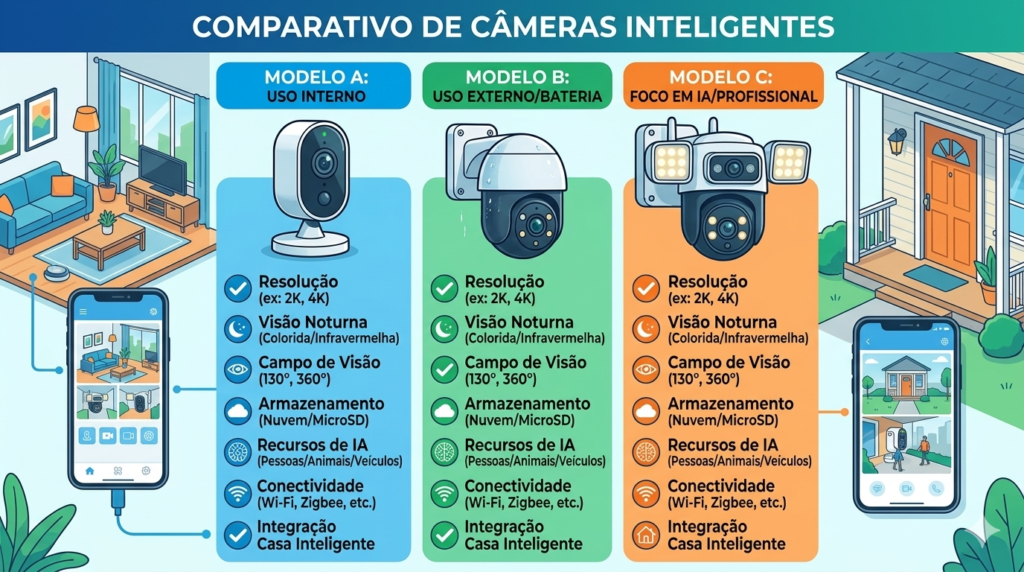 Hoje, muitas câmeras inteligentes oferecem recursos avançados como visão noturna, detecção de movimento com inteligência artificial e integração com assistentes virtuais. Além disso, grande parte dos modelos disponíveis no Brasil já permite gravação em nuvem ou em cartão de memória.